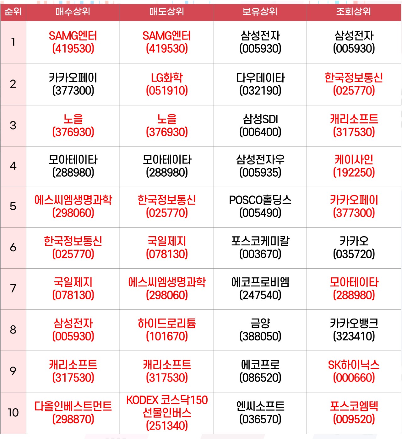 우수투자군의 전일기준 매수상위종목, 매도상위종목, 보유상위종목, 조회상위종목을 소개합니다.