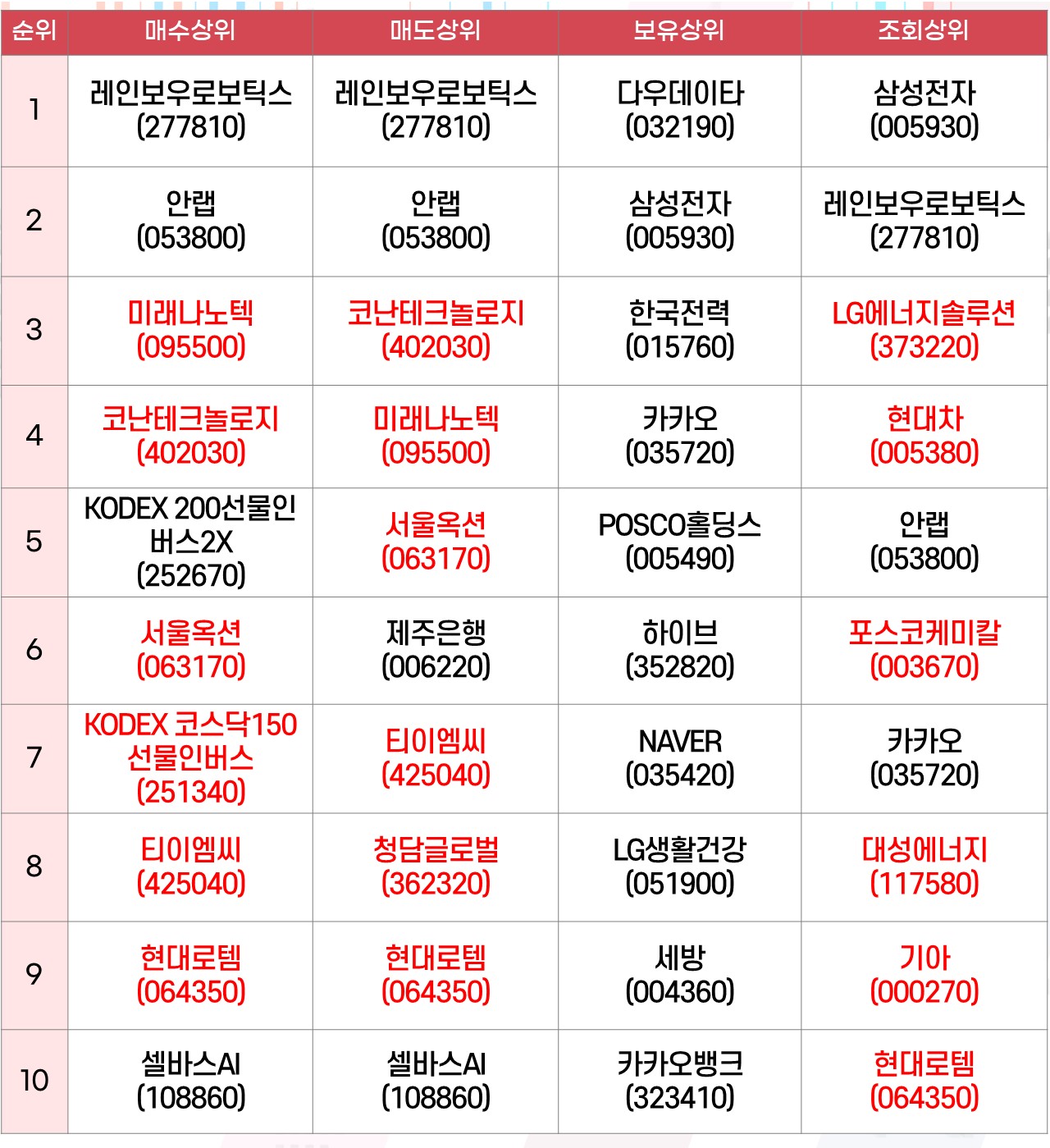 우수투자군의 전일기준 매수상위종목, 매도상위종목, 보유상위종목, 조회상위종목을 소개합니다.